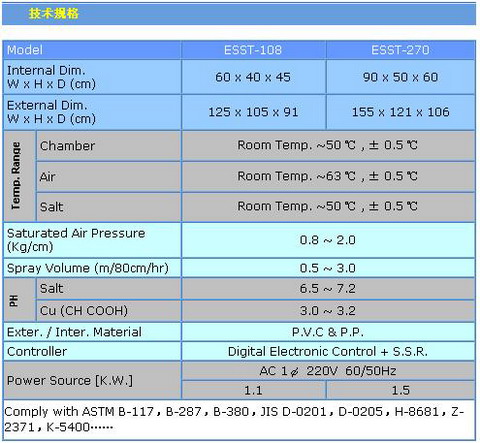 產(chǎn)品特色: 整座 P.P. & PVC 堅實力學(xué)結(jié)構(gòu),耐酸堿,耐溫永不老化,適用于鹽霧,醋酸銅...等各種測式規(guī)格。 專利噴頭與錐型擴散裝置使落霧快速均勻。 具有手動及全自動控制方式,最大設(shè)定時間可達 9,999 Hrs。 實驗完成后,具有自動除霧裝置,可清晰觀察試驗室內(nèi)之試品。 復(fù)合式鹽霧箱的進氣溫度、箱內(nèi)溫度、測試液溫度三套完整溫度控制系統(tǒng),確保實驗之準(zhǔn)確性與標(biāo)準(zhǔn)性。