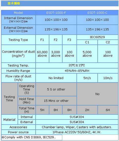 產品特色: 符合自動車部品、電氣部品對于塵埃的耐久性。 浮游式的防塵及耐塵試驗。 采用大型透明壓克力窗口(尺寸W60㎝×H70㎝),方便直接觀測內部試品狀況。 粉塵數據符合JIS-D-0207-F2規范。 濕度采用直讀及免加水SENSOR。 數字設定、操作簡便、保養容易。 型號GSDT-1000-C for IEC-529。